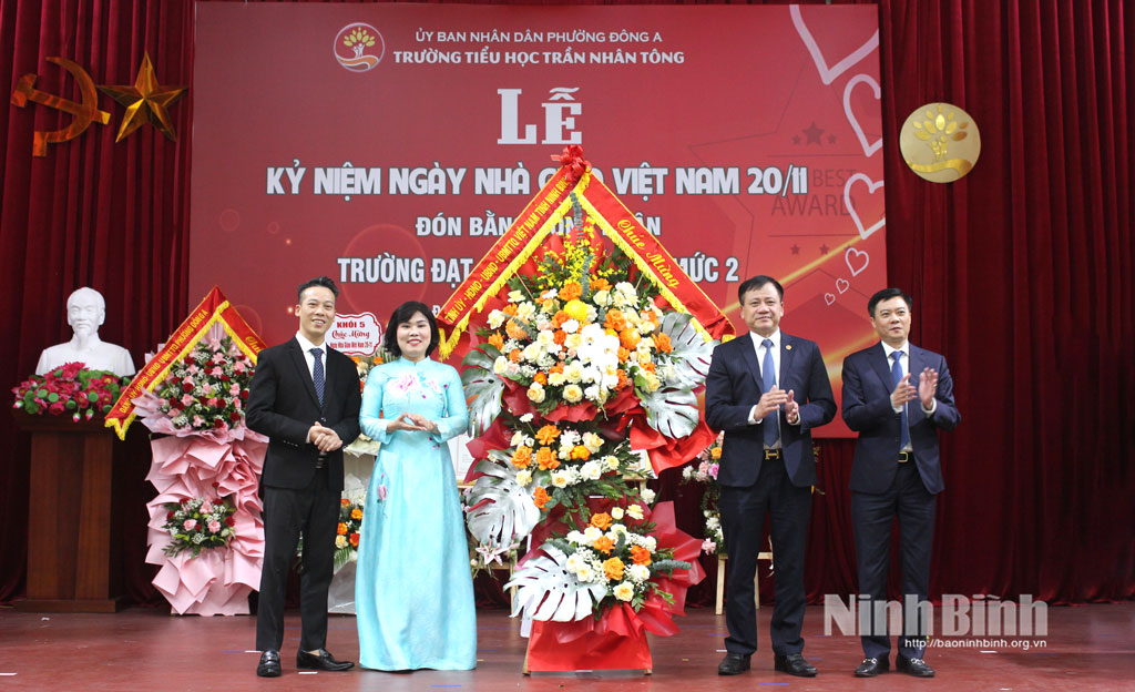 Đồng chí Phó Chủ tịch HĐND tỉnh Mai Thanh Long và đồng chí Bí thư Đảng ủy phường Đông A Nguyễn Xuân Hồng tặng tập thể Trường Tiểu học Trần Nhân Tông lẵng hoa tươi thắm chúc mừng Ngày Nhà giáo Việt Nam 20/11.
