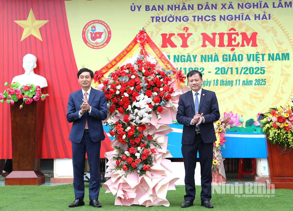 Đồng chí Mai Thanh Long, Tỉnh ủy viên, Phó Chủ tịch HĐND tỉnh tặng hoa chúc mừng Trường THCS Nghĩa Hải nhân kỷ niệm Ngày Nhà giáo Việt Nam 20-11.