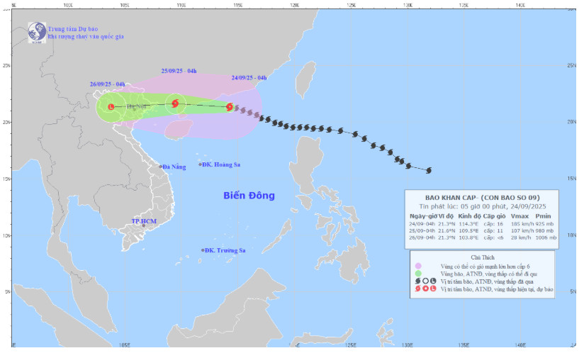 Theo dự báo của Trung tâm dự báo khí tượng thủy văn quốc gia, hồi 04 giờ ngày 24 tháng 9 năm 2025, vị trí tâm bão ở vào khoảng 21,3 độ vĩ bắc; 114,3 độ kinh đông, trên vùng biển phía Bắc của khu vực Bắc Biển Đông, cách Móng Cái (Quảng Ninh) khoảng 650km về phía Đông, sức gió mạnh nhất vùng gần tâm bão mạnh cấp 15-16 (167-201km/giờ), giật trên cấp 17. Bão di chuyển theo hướng Tây Tây Bắc với tốc độ khoảng 20km/h. Dự báo trong ngày 25 tháng 9 bão đổ bộ trực tiếp vào đất liền khu vực Bắc Bộ nước ta