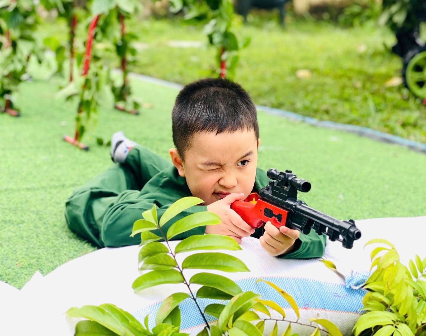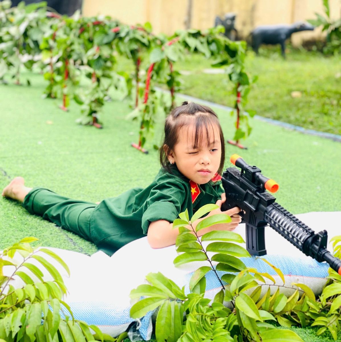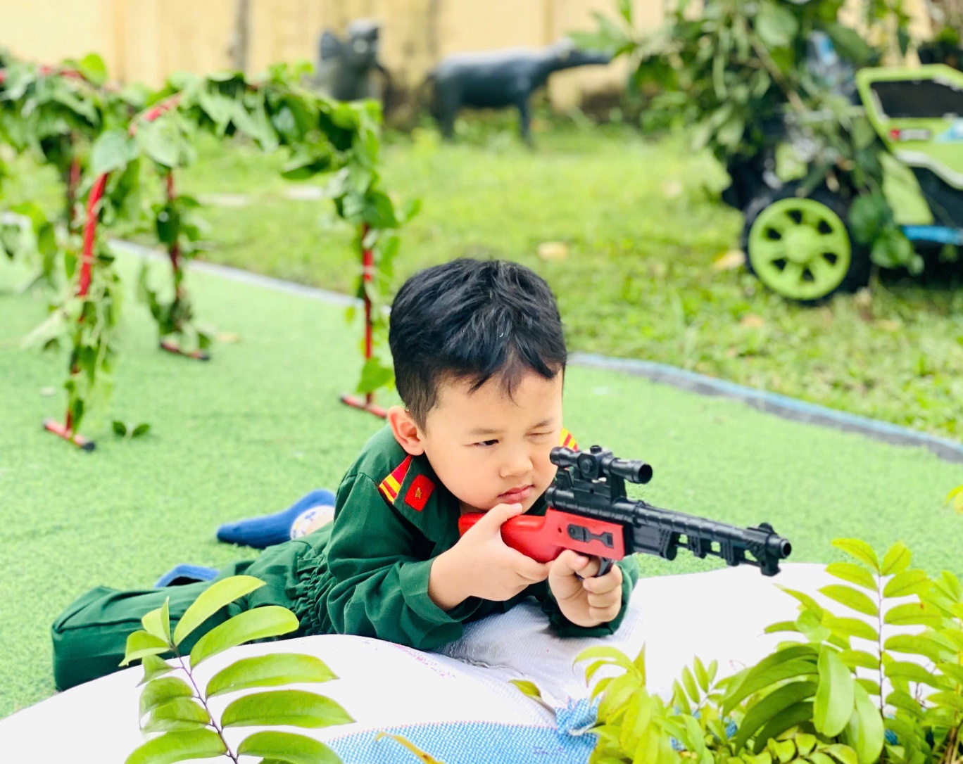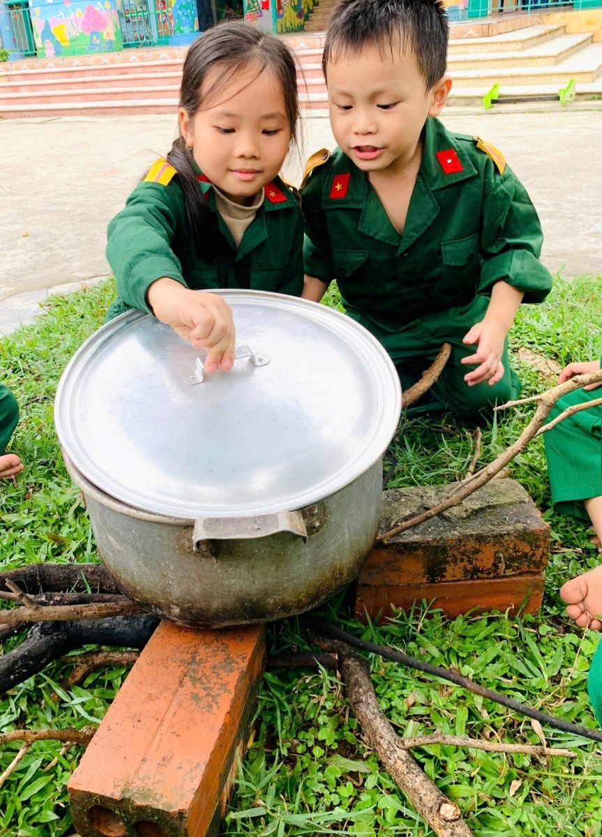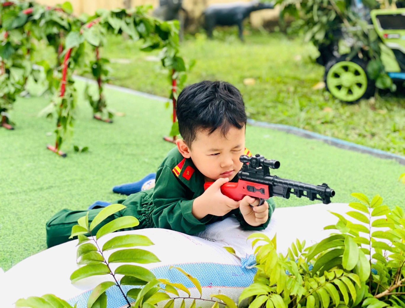 Với chiếc mũ tai bèo các bé tự làm, trang phục xanh và nụ cười rạng rỡ, các bé không chỉ được tìm hiểu về công việc và cuộc sống của các chú bộ đội mà còn tham gia vào nhiều hoạt động thú vị như: