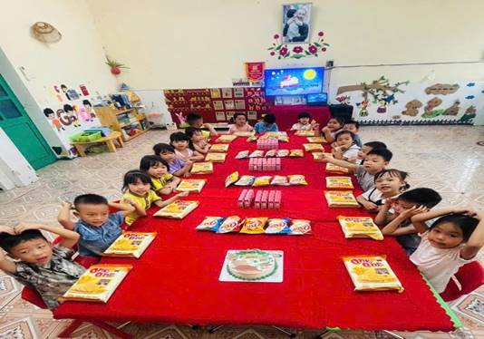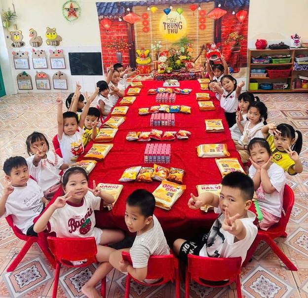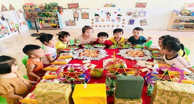 Các cô giáo bày mâm cỗ đón trăng. Quả bưởi vàng rám nắng, cuống là tươi xanh được đặt ở giữa, xung quanh là những quả hồng đỏ tươi, chín mọng. Nải chuối tiêu lốm đốm trứng. Chiếc bánh nướng hình mẹ con đàn lợn nằm quây quần bên nhau trông mới ngộ nghĩnh làm sao! Một mùi hương dịu ngọt lan tỏa trong không gian đang rộn ràng tiếng cười tiếng nói trẻ thơ.