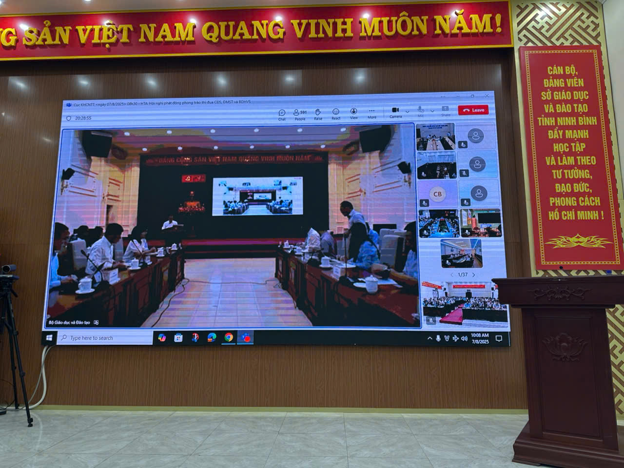 Ngày 6/8, Bộ Giáo dục và Đào tạo (GD&ĐT) tổ chức Hội nghị trực tuyến về triển khai phong trào “Cả nước thi đua đổi mới sáng tạo và chuyển đổi số” và “Bình dân học vụ số” của ngành Giáo dục. Tại điểm cầu tỉnh Ninh Bình có ông Đinh Quốc Trường, Phó Giám đốc Sở GD&ĐT cùng đại diện lãnh đạo các phòng thuộc Sở, các đơn vị trực thuộc Sở GD&ĐT tham dự.