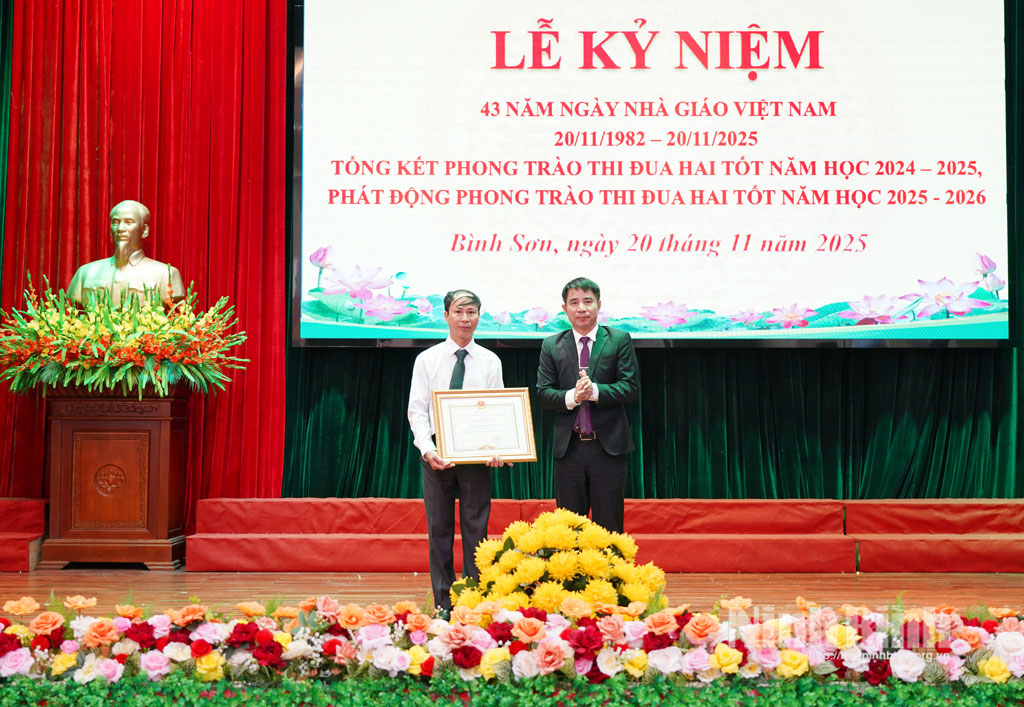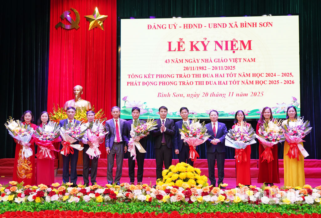 * Sáng 20/11, Đảng ủy, HĐND, UBND xã Bình Sơn tổ chức kỷ niệm 43 năm Ngày Nhà giáo Việt Nam (20/11/1982-20/11/2025); tổng kết phong trào thi đua hai tốt năm học 2024-2025. Dự, chúc mừng Ngày Nhà giáo Việt Nam có lãnh đạo Đảng ủy, HĐND, UBND xã Bình Sơn.