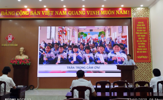 Sáng ngày 17 tháng 10 năm 2025, tại Sở Giáo dục và Đào tạo tỉnh Ninh Bình đã diễn ra cuộc họp giữa đại diện Tổ chức Room to Read (RtR) Việt Nam với Ban điều phối Chương trình Thư viện thân thiện tỉnh Ninh Bình và Đại diện Ban Điều phối của Bộ Giáo dục và Đào tạo (GD&ĐT).