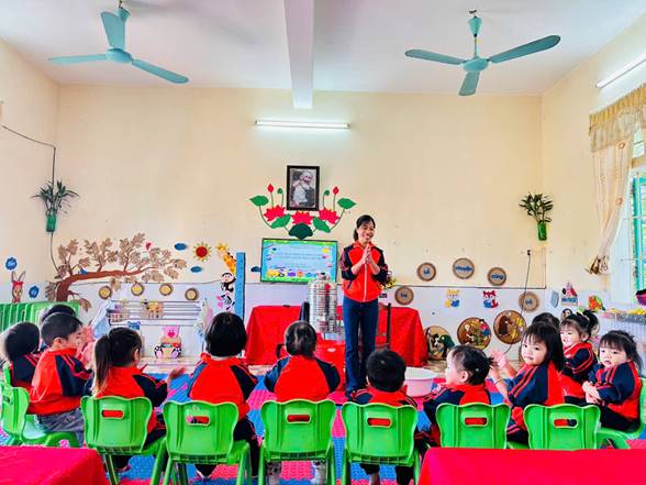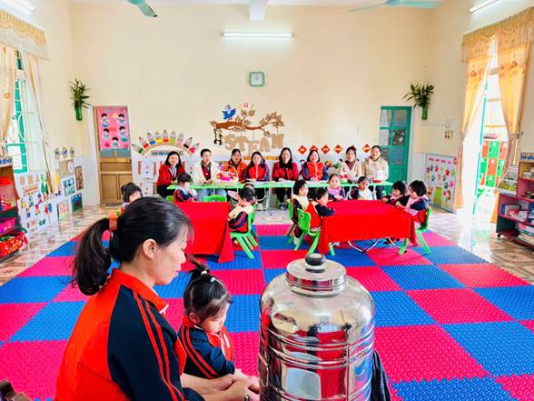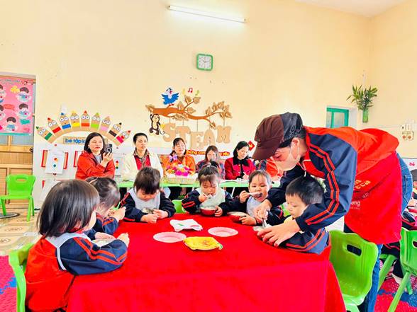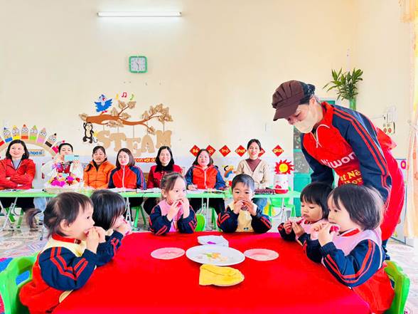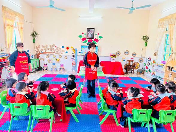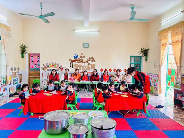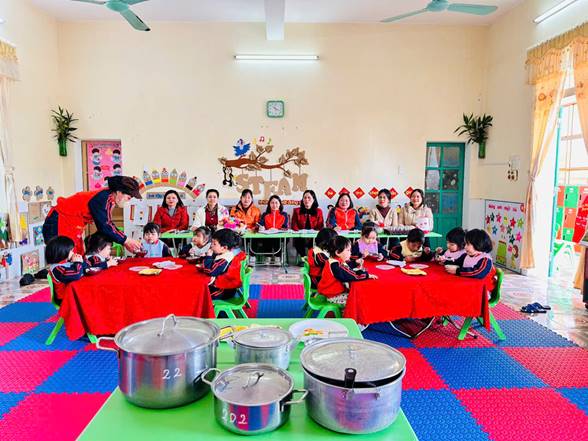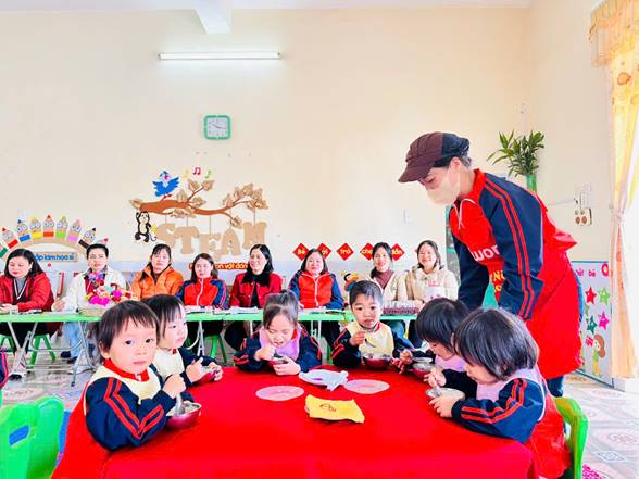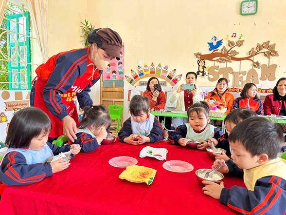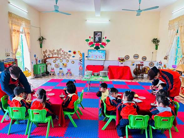 Bên cạnh đó, giờ chia ăn cho trẻ không chỉ đơn thuần là cho trẻ ăn no mà còn giúp trẻ làm quen với nề nếp sinh hoạt tập thể. Trẻ học được cách ngồi ăn đúng chỗ, chờ đến lượt, biết sử dụng thìa, cốc và tập ăn gọn gàng. Qua đó, trẻ phát triển tính tự lập, kỹ năng vận động tinh và hình thành thái độ tích cực đối với bữa ăn. Khi cô giáo quan tâm, động viên và chia khẩu phần phù hợp, trẻ sẽ ăn ngon miệng hơn và cảm thấy được yêu thương, chăm sóc.
