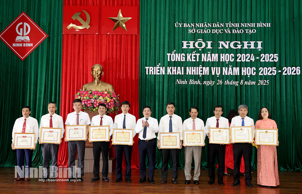 Đồng chí Nguyễn Tiến Dũng, Tỉnh ủy viên, Giám đốc Sở Giáo dục và Đào tạo Ninh Bình trao giấy khen cho các tập thể.
